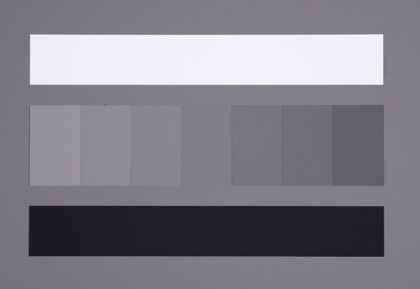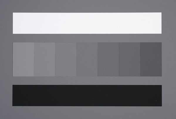 The plain 18% grey back of the test card is ideal for white balancing and spot metering. The front side has an 18% grey field plus a central array of seven grey patches in 1/6th stop increments, plus and minus 0.5EV either side of 18% grey. Above this is a white strip 2.33 EV brighter than 18%, and below it a black strip 2.33EV darker.
